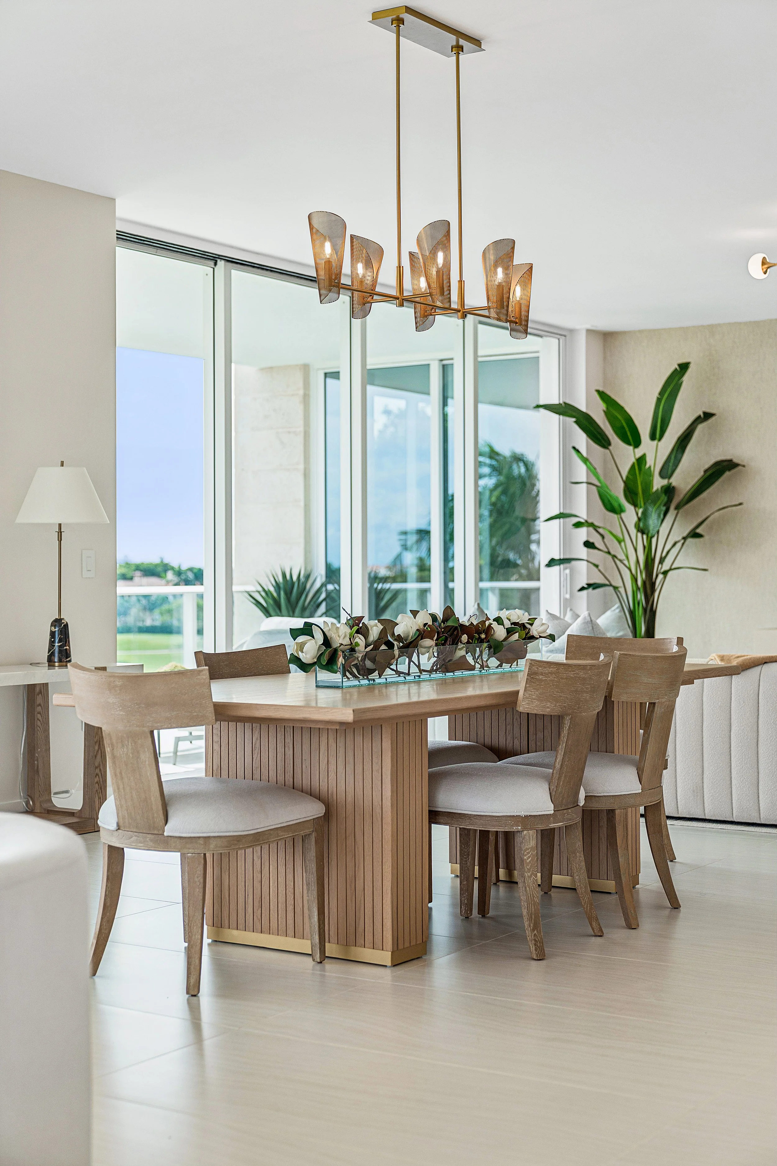 Statement chandeliers, especially over dining tables, are used to anchor rooms and add visual rhythm without overpowering the design.